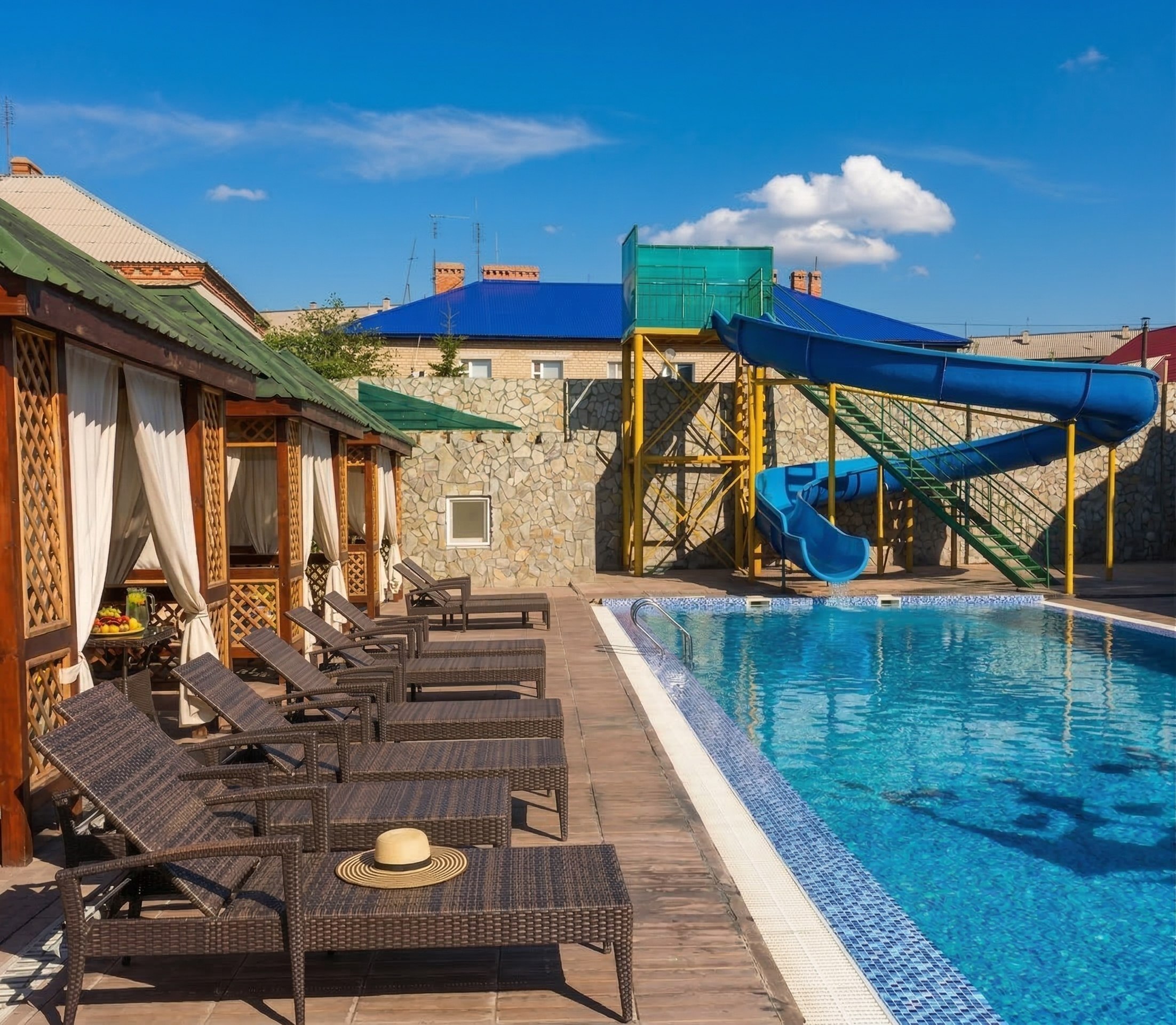 Большой бассейн, с подогревом и аквагоркой... Летом - то, что надо!