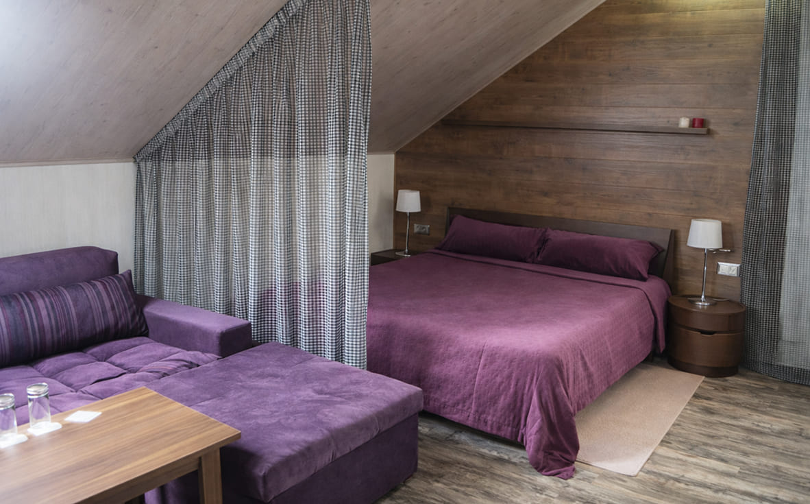 Номер класса люкс - очень просторный, уютный номер, на одного или двоих гостей, возможно два дополнительных размещения. С панорамным окном на небо. Состоит из прихожей, спальной комнаты, рабочей зоны, места отдыха, совмещенного санузла и гардеробной.